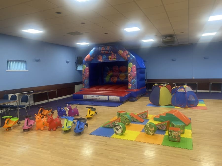 This package includes 12ft by 12ft Bouncy Castle, 11 Piece Soft Play with 8ft by 8ft playmat area, Tunnels with 8ft by 8ft play-mat area, 5 swivel cars and 3 animal hoppers.